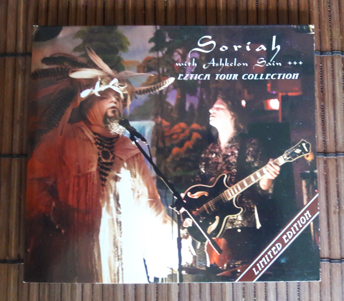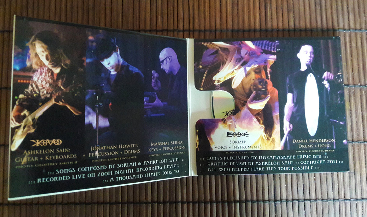 "Eztica Tour Collection" CDr was self-released by the band as a limited edition in attractive eco wallet to support their 2012 summer tour mostly through US west coast. Since I am living far away in Central Europe, I immediately started to hunt for this rare item, because I really can't imagine missing this beauty. Yes, since exploring "Atlan" CD and numerous pictures and videos from spectacular live shows that followed, I was always dreaming about seeing these, Portland based guys live. Unfortunately, my dream didn't come true yet, but "Eztica Tour Collection" brings me very close. "Atlan" was a big revelation and "Eztica" only confirmed the huge potential of the kindred synergy between Soriah and Ashkelon Sain. Of course I must add this live gang features except Soriah (voice, instruments) and Ashkelon Sain (guitar, keyboards) also Jonathan Howitt (percussion, drums), Marshal Serna (keyboards, percussion) and Daniel Henderson (drums, gong). "Eztica Tour Collection" is a collection of 9 tracks, recorded during September 2011 in four different venues in Seattle, San Francisco, San Jose and Hollywood. "Nica Anahuatl" ignites the show with rather rawer and mysterious, mostly percussive-infused mood with shamanistic wordless vocals that perfectly paint the atmosphere of the whole set. Tranquil flute opens "Tonacayotica", but soon Ashkelon's sharp guitar riffs and vibrant drumming steal the show, soon followed by Soriah's impressive vocals. The next track is comprised of "Ticochitlehua" and "Eztica", where the first half is more primordial and cacophonous with Soriah's prayers. The second part kicks right away with highly infectious blend of Soriah's throat magics, explosive percussions, warmly drifting washes and erupting guitar by Ashkelon. The first absolute highlight is here and the stage is on fire!!! But that's just the beginning, because "Cehui" follows and that's a true Hall Of Fame track since the very first day I explored it on "Atlan"!!! And yes, also the live version is as much magical as its studio version. Soriah's fascinating voice palette magnificently interplays with gentle tribal drumming and tinkles and surrounded by deeply immersing background atmozones. A truly shamanistic and blissful journey!!! "Iix" is invaded by electrifying guitars, perfectly blended with expressive voices, evocative soundscapes and raw, high-pitched percussions assaulting my eardrums. And filled with stirring energy and infectious melodies. Another stunning live track!!! The next piece "Aldan Ool" features solo throat singing by Soriah and this piece is dedicated to Aldyn-ool Sevek, a prominent Tuvan throat-singer and one of the masters of Soriah, who died 10 days before this piece was performed in San Francisco. "Xopancuicatl" is the most melodic piece here with a very tranquil and heartwarming melodies, catchy tribals and tinkling percussions and Soriah's raw voice magics. Absolutely phenomenal!!! But most likely I will be speechless shortly, because another milestone comes. Yes, "Xiuhcoatl" was one of the highlights on "Eztica" and this live version is no exception. Just like on "Cehui", Soriah's voice works here as another instrument brilliantly merged with leading razor sharp percussions and backed by cinematic atmospheres. Undoubtedly another virtuoso performance!!! But Soriah keeps on excelling with his throat wizardry also on the closing "Atlan" piece, which masterfully fuses exotic strings with panoramic drifts and hard-hitting drums. Deeply mysterious "Atlan" is a finale of high caliber!!! Soriah with Ashkelon Sain and their live crew showcase on "Eztica Tour Collection" all their talent, passion, chemistry, nuance and musicianship in galvanizing and breathtaking live action, I am dying to see them live one day!!!